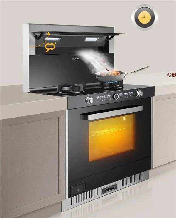 佳歌蒸烤一体集成灶集成专业级烟机、灶具、蒸箱、烤箱、消毒柜,21m3/min增压劲吸吸净油烟,5.0kW猛火爆炒给力,爆炒辣椒不呛鼻。