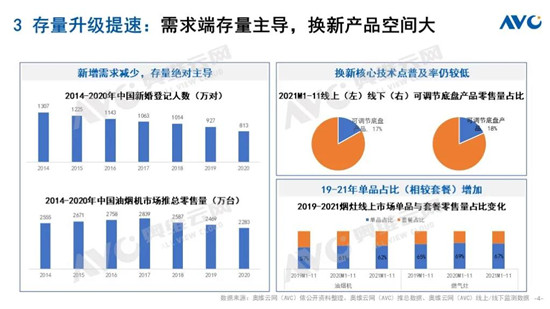 以油烟机为例,对比我国历年新婚登记人数与油烟机市场总零售需求,不难发现厨卫市场传统品类实际上已经存量绝对主导。同时从单品与套餐的需求关系也能验证这一点,据奥维云网(AVC)线上监测数据显示,2019年1-11月累计油烟机单品零售量占比为57%(单品零售量/单品+套餐零售量),到2021年1-11月增加至62%。