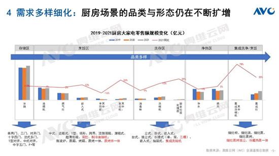 从品类端来看,集成灶、嵌入式微蒸烤以及洗碗机的出现让厨卫市场进一步扩容,保持着较其他家电更高的活力。从产品款式来看,各品类的形态也在不断创新,像制冷油烟机、双腔油烟机等。对于厨卫市场,无论是多功能的集成创新还是专业度更高的单功能分体式创新,我们期待2022年更多的新面孔。