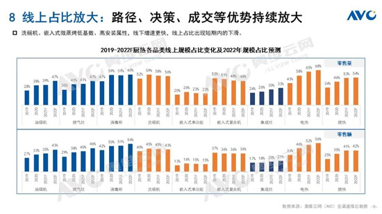 据奥维云网(AVC)推总数据显示,除洗碗机、嵌入式微蒸烤低基数、高安装属性,线下增速更快,线上占比出现短期内的下滑之外,中国厨卫市场其他品类线上占比呈逐年增长趋势。