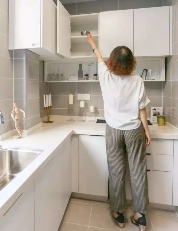 厨房的主要收纳场所是顶柜和地柜。然而对老年人来说,顶柜的高度太高,每次取放都很费力,而地柜又太矮,需要弯腰甚至下蹲。