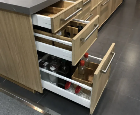 地柜建议选择抽屉式厨柜,上层放置常用的铲勺刀叉,不用弯腰就能取放,下层放置一些不常用的烹饪工具,例如小奶锅、平底锅、高压锅等。