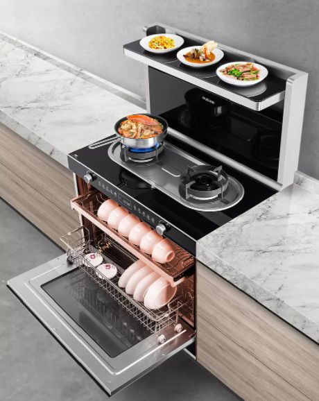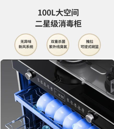 碗盘不应该在台面堆成一摞,而应该有专门的收纳保洁场所。佳歌消毒柜款集成灶就是好选择。