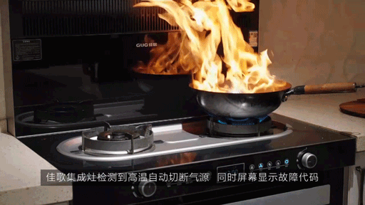 我们模拟油锅起火状态进行测试。佳歌集成灶搭载的双重防火墙通过左右双感应探头连接防火墙温度传感器,当检测到防火墙温度过高,任意一个传感器均能及时感知切断气源,确保用户爆炒无忧。