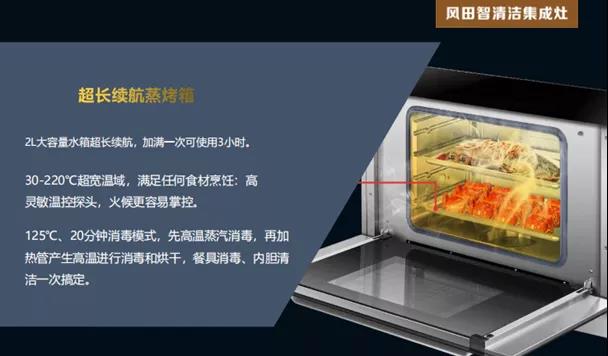 风田及时洞察消费的的使用需求,全力打造带有消毒功能的集成灶——T9A-ZK抗油污蒸烤一体集成灶上有125℃消毒模式,持续时常20分钟,启动后先高温蒸汽消毒,后加热管高温消毒烘干,餐具消毒、内胆清洁一次搞定,连消毒柜的活儿也包了!
