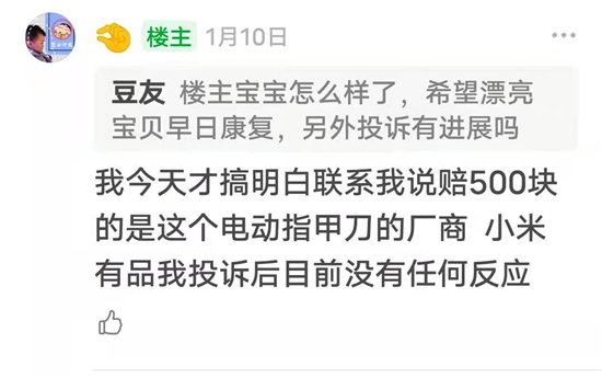 对于事件本身,有网友指责厂家对于产品只强调安全但没有强调安全的限制范围,也有网友认为主要责任在于家长让小朋友独自接触了电动指甲刀产品……截至目前,楼主并没有在豆瓣更新与商家间协商的进程,整个事件的评判可能还是要交给相关部们由专业人士来判定了。