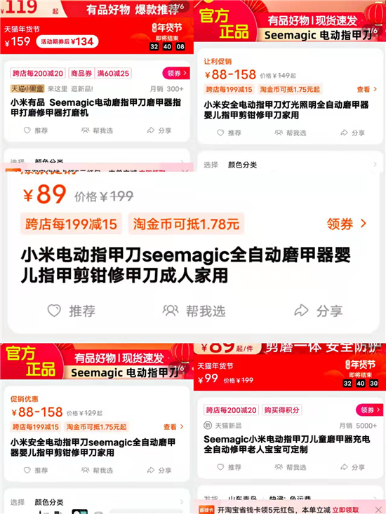 在小米优品平台搜索,该电动指甲剪全称为Seemagic电动指甲刀,售价129元,在京东和淘宝平台也均有售,价格最低为89元。