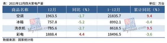 12月全国冰箱产量757.8万台,同比下降5.2%;1-12月累计产量8992.1万台,同比下降0.4%。