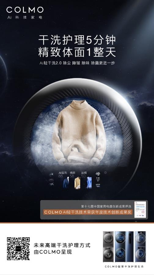 COLMO品牌之夜上亮相的TURING套系智慧干洗护理空间站就具有非常重要的意义。它不仅代表了当前家庭洗护行业的最高产品水准,其拥有的AI轻干洗2.0技术,更是拉开了洗护“干时代”的序幕。