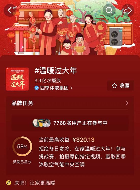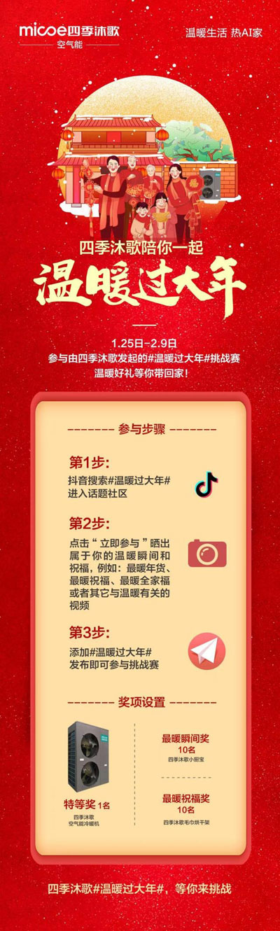 这个春节,无惧严寒,四季沐歌带你感受四季如春的温暖,用创新科技将温暖传递给千家万户。而在这喜庆暖心的阖家团圆里,四季沐歌同样希望把这份“温暖”带给大家。为此,四季沐歌特别发起#温暖过大年#抖音区域挑战赛活动,只要你在活动期间拿起手机打开抖音,参与#温暖过大年#挑战赛话题,点击“立即参与”并晒出属于你的温暖瞬间与祝福,如“最暖年货”、“最暖祝福”等,最后添加#温暖过大年#,简单几步即可成功参与挑战,和全民一起来PK。