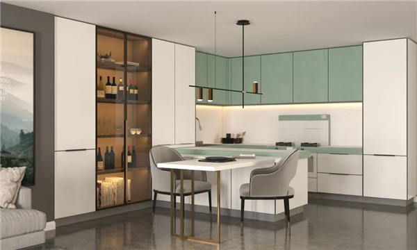 厨电与厨柜在颜色、布局上完美结合,和谐统一,宛若天成。雅致的岩意抹茶绿,纯净的油砂白,营造出清新自然的画面。U型的布局,流畅的动线,操作得心应手,烹饪无所束缚,厨房享受应如是。
