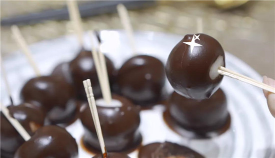 握着牙签棒,让白白胖胖的汤圆在巧克力浆中肆意徜徉,均匀裹上一层巧克力外衣,就可以装盘啦。装盘后继续放冷冻室冷冻至表面硬化,取出即可食用!