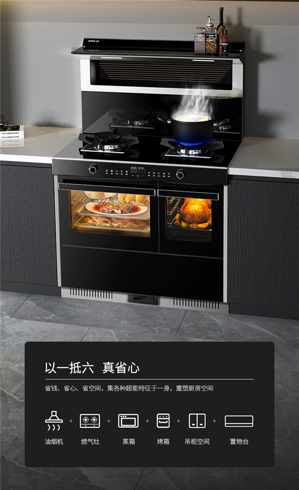 亿田S8A蒸烤独立集成灶,尖端集成科技,融合各项日常厨电功能。一台集成灶,便可释放出原来传统厨房所需的烟机+灶机+蒸箱+烤箱的占地面积。此外,亿田S8A蒸烤独立集成灶还兼有吊柜空间、置物台等功能,一台机器抵六大厨电功能,省钱、省心、更省空间!