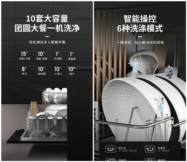 亿田XE92P集成水槽洗碗机,配置大容量洗涤空间,15个大/小碗+10个深/浅盘+各种杯碟碗筷,一机洗净,轻松满足多人聚餐需求。六大智能模式,一键清洗,让你无需再为洗碗劳累而烦恼。省出一些额外的时间,或用作休息,或娱乐放松心情,更好地摆脱“节后综合症”!