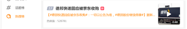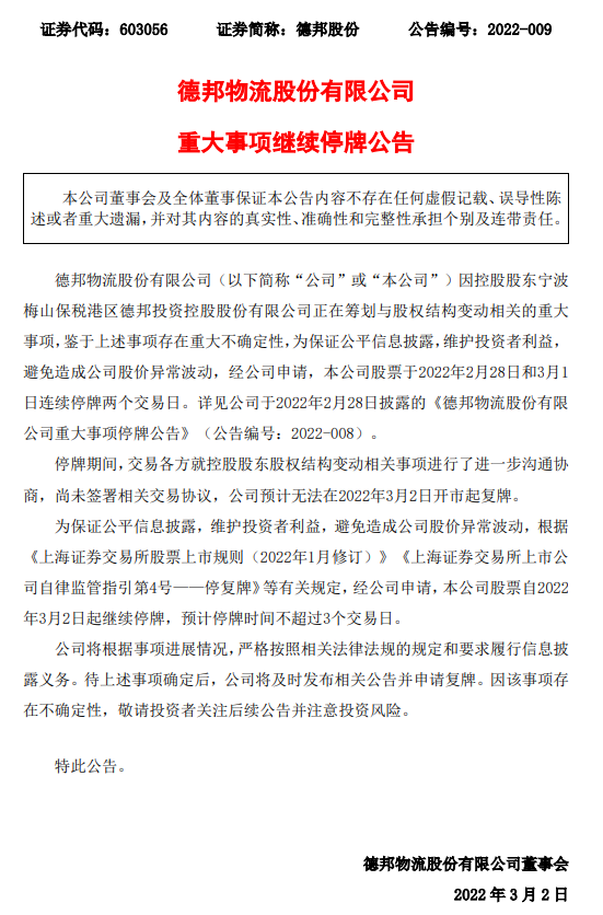 对此京东方面暂未回应,德邦则回应称一切以公告为准。德邦最新的公告显示,其控股股东正在筹划与股权结构变动相关的重大事项,公司股票自2022年3月2日起继续停牌。