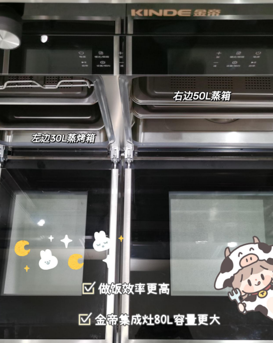 金帝双蒸一烤集成灶拥有两个单独的箱体左边30L蒸烤箱,右边50L蒸箱,加起来足足有80L,比其他区区只有50L的蒸烤集成灶来说,容量不止大了一点点呢~