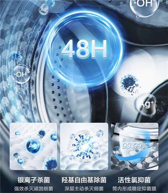 在疫情的大背景下,衣物在清洗过程中是否具有杀菌效果也成为了很多家庭比较看重的方面。小天鹅本色系列洗烘套装配备了双效除菌功能,从两大方面保证了中国家庭的洗衣健康。首先是蓝氧技术,它可以直接致使微生物裂解和死亡,实现有效的杀菌消毒作用;另一方面,这款产品还配备了银离子杀菌技术,同样可以实现强效杀灭顽固细菌的效果。同时在蓝氧分子和银离子的共同作用下,小天鹅本色系列洗烘套装的桶内可以形成48小时的长效抑菌保护膜,实现99.99%的杀菌率,我们再也不用担心衣物残留细菌病毒危害家人健康了。