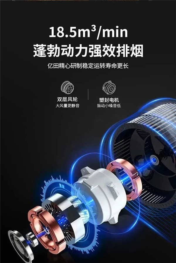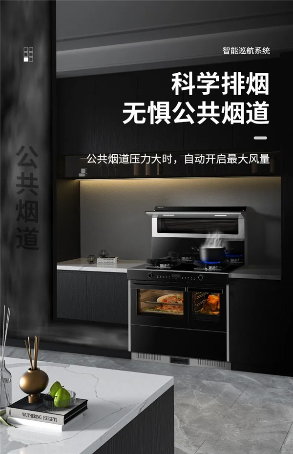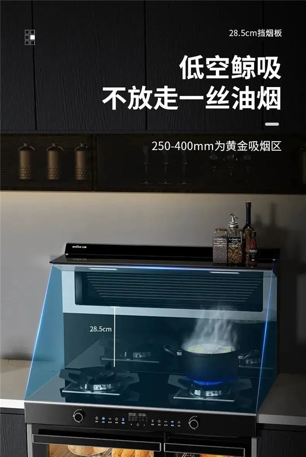 亿田S8A蒸烤独立集成灶,将挡烟板高度升级至28.5cm,配备18.5 m3/min超大风力,叠加“侧吸下排”技术,油烟吸净率高达99.95%。另外,智能巡航系统,自动开启最大风量,科学排烟,厨房始终保持无油烟的清新状态。
