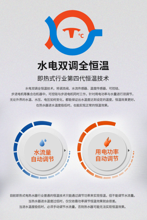 据了解,目前即热式电热水器行业普通的恒温技术只能通过调节功率来实现恒温,但不能调节水流量。当进水温度极低时,必须手动调节水流量,否则的话热水器可能无法实现恒温效果。