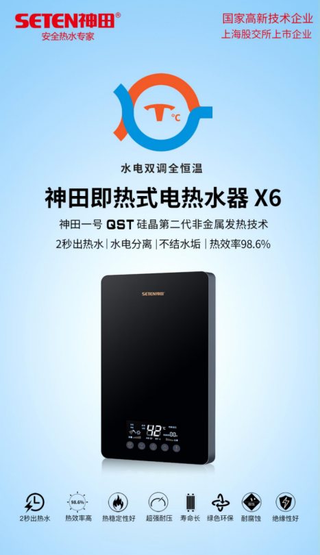 刘付志成介绍,在继X6之后,神田在2022年将会再推出二款水电双调全恒温即热式电热水器,神田水电双调全恒温产品将达到五款,丰富的产品线也在行业内领先。