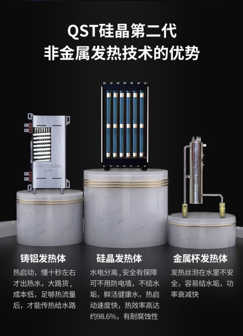 神田一号QST硅晶第二代非金属发热技术。QST硅晶发热技术,热启动快,2秒出热水。热效率高达98.6%,水电分离,不结水垢。目前金属杯发热体、铸铝发热体很难达到这样的启动速度与热效率,金属杯发热杯因为易结水垢不适合在水质差的地区使用。