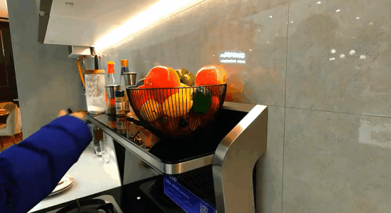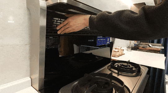 可见逸散到外面的蒸汽在烟机开启后瞬间被完全排走,拢烟范围基本覆盖了从置物架到燃气灶边缘区域,只要炒菜前提前开好油烟机,完全不用担心油烟跑到厨房外面。