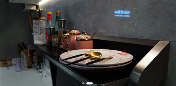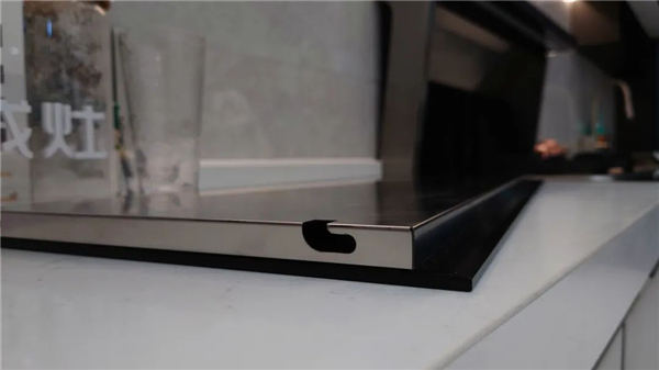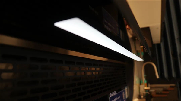 置物台的背面则是一个长条LED灯,在没有其他灯光辅助照明的情况下,亮度也足够照亮整个灶台,LED灯内嵌在钢化玻璃上,摸起来无缝也无凸起,沾上灰尘、油污也很好清理。