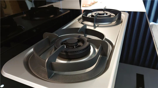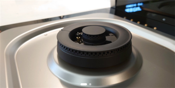 烟机模块往下,便是下厨者最看重的燃气灶,气灶的左右炉头被宽幅承液盘所包围,煮东西不小心溢锅也不用担心洒到外面,承液盘的周围还铺设了一层高强度黑晶玻璃,光可映人。