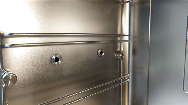 左侧的两个小圆孔是H6ZK-1最值得期待的蒸汽直喷装置。在以使用传统蒸发盘为主流蒸制方式的市场里,使用蒸汽直喷的蒸烤一体集成灶可谓是凤毛麟角。