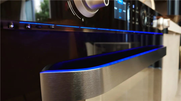 不锈钢拉丝门把手质感优秀,宽度也正合适,手不大的人也能一手握持,里侧进行了圆弧处理,拉门感觉圆润而不割手。把手的正上方还设有一行蓝色LED灯辅助照明,在昏暗的厨房里氛围感十足。