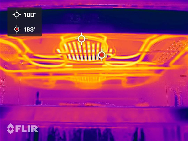 通过热成像仪显示的结果可以看到,顶部的加热烤管也参与了蒸制的过程,主要目的是防止内腔顶部的冷凝水滴落到包子等食材表面,使食材表面受潮变软,影响口感。