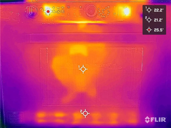 等到蒸烤箱自动预热完成,内腔温度达到100℃时,我们使用多光谱红外温度探测仪测得,蒸烤箱的玻璃门中心温度为22.2℃,表面的发热量微乎其微,隔热表现不错。