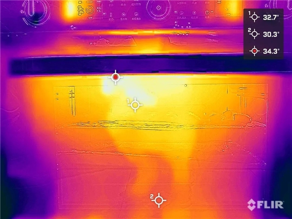 等到蒸烤箱温度升至180度,我们继续使用多光谱红外温度探测仪测试蒸烤箱玻璃门温度,测得门板的最高温度仅为34.3℃。可以看到即使是在180℃的高温下,H6ZK-1搭载的三层隔热玻璃和专门的散热系统也有着不错的隔热效果,用手触摸也只是感觉温热,不用担心手被烫到。