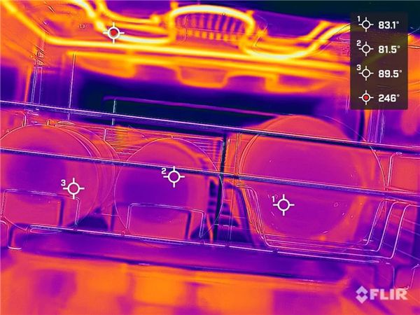 高温消毒过程中,我们用多光谱红外仪探测蒸烤箱内部温度,测得加热管的温度高达246℃,各个位置的碗碟温度被加热至80℃以上,能起到很好的消毒杀菌效果。