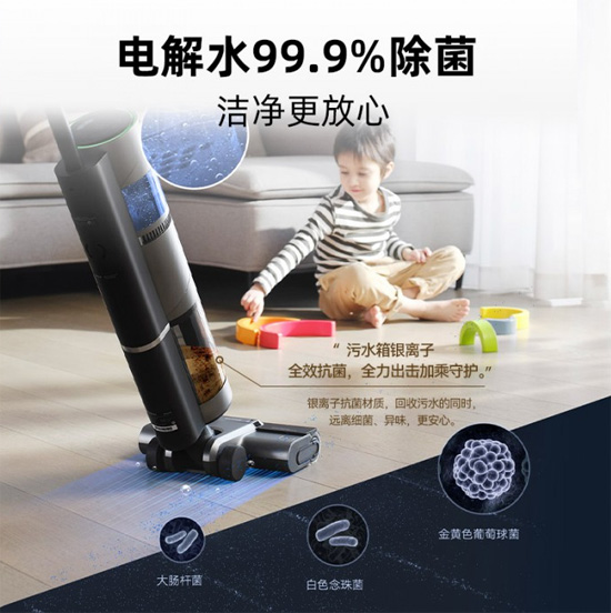 在后疫情时代,“除菌”成为了家居清洁更深一层的需求。为了给使用者带来更安心洁净的居家环境,追觅无线洗地机H12特别添加了除菌功能。通过电解水原理将自来水转化为过氧化氢溶液,不需要额外的使用任何消毒液,即可实现地面的除菌。尤其对于有宠物和小孩的家庭来说,任何消毒液都有一定的误食风险,而电解水溶液则彻底避免了这种烦恼。