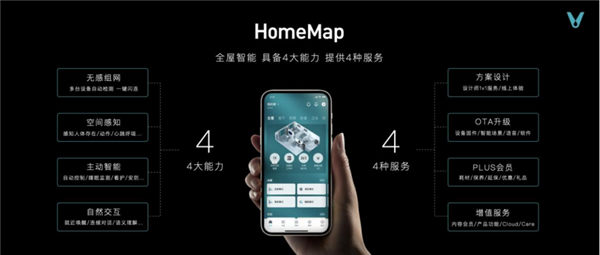 此前,云米就着力为每个家构建一张基于环境、设备与用户数据的HomeMap,再结合对用户需求的感知与推理,让家可视化和轻松掌控。本次全新升级的HomeMap方案则进一步提升用户的智能体验,依托Alpha X毫⽶波超视感知雷达,通过四大能力和四大服务,打造「一站式全屋智能」解决方案。