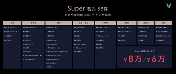 针对行业精英群体,云米搭配了定位高端的Space套系,囊括86件智能产品,适用于5房2厅的千万级豪宅,总价20万;针对都市中产人群,云米推出了Super套系,囊括56件智能产品,适用于3房2厅的百万级洋房,总价6-8万,充分满足不同家庭的个性化需求。