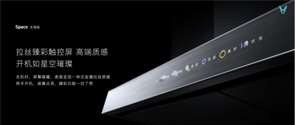 设计上,Space云米AI智目油烟机采用拉丝臻彩触控屏,精致外形体现对美好厨房的生活追求。关机时,屏幕隐藏,表面呈现⼀体式金属拉丝质感。挥手开机,屏幕点亮,如星空璀璨,臻彩功能一目了然。