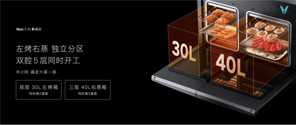 Navi 3云米AI集成灶,烟机智能升降,与灶台融为一体,美观易清洁。使用时,烟机自动升起,低空近吸,高效排烟。关机后,烟机自动下降,收纳于柜体内,节省空间,美观大气。左烤右蒸灶台设计,独立分区,双腔5层同时开工,30分钟轻松搞定六菜⼀汤,为都市白领在忙碌的生活节奏中提供便利,更好地做到工作生活两不误。