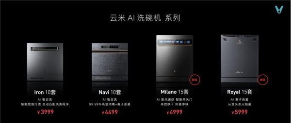 云米AI洗碗机系列,除了有省电和省时兼备的Milano云米AI洗碗机(15套)外,还有Iron洗碗机,AI智目洗,智能检测污渍,自动匹配洗涤程序;Navi洗碗机,AI智目洗,99.99%高温消毒+离子杀菌;Royal洗碗机,AI离子杀菌,从源头杀灭细菌。云米满足日常不同中国家庭的洗碗需求,全方位提供优质洗碗机服务。