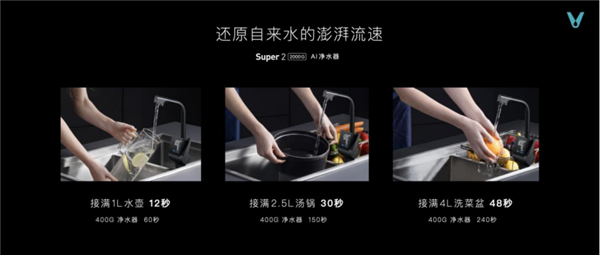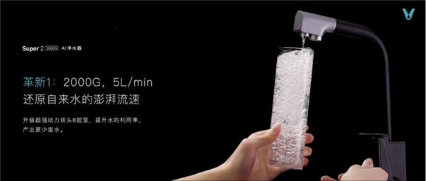 革新1:5L/min超大水量,还原自来水的澎湃流速 Super2 2000G云水·泉先AI净水器以2000G滂湃海量,升级超强动力双头8腔泵,提升水的利用率,产出更少废水,让流速时间更快:以12秒接满1L水壶;30秒接满2.5L汤壶;48秒接满4L洗菜盆的惊人速度,解决传统净水器出水量小、时间久等问题。