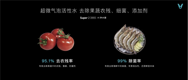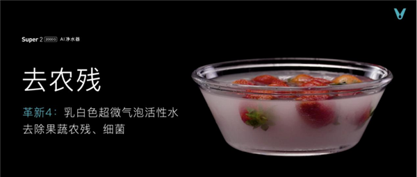 革新4:乳白的超微气泡活性水去农残率超95% Super2 2000G云米·泉先AI净水器不仅在清洗果蔬时能达到95.1%去农残率,有效去除果蔬中的农残、激素、防腐剂;在清洗海鲜时,更能达到99%除菌率有效去除海鲜中的细菌、有害添加剂,还原鲜甜本味。Super 2更采用炫彩大屏双出水龙头用水量、水质实时看得见,让消费者不仅可以用得放心,更能吃得安心。