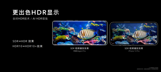 荣耀Magic4系列搭载的屏幕不仅同时实现了LTPO和高频PWM调光,还具备超强的规格参数,适配真10.7亿色彩显示,支持100% DCI-P3广色域和HDR 10+认证,独立的MEMC显示芯片,给消费者带来更加锐利、真实的阅读、影音和游戏表现力,让用户能够享受一系列生动的色彩和惊艳的清晰度。