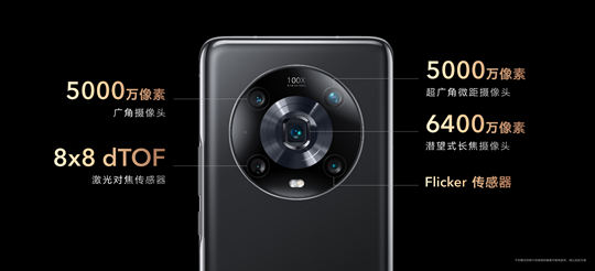 荣耀Magic4系列的影像硬件规格全面升级,搭载业内顶级摄像头模组,为多主摄计算摄影技术的跨越打下基础。其中,荣耀Magic4 Pro搭载5000万像素1/1.56英寸大底主摄,5000万像素超广角镜头,支持100倍数字变焦的6400万潜望式长焦摄像头,前置镜头则配备了1200万超广角与3D ToF镜头组合。