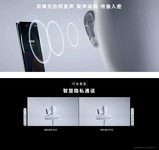 荣耀Magic4 Pro和荣耀Magic4 至臻版搭载行业首创智慧隐私通话功能,解决了很多用户接听电话的漏音痛点,该功能以荣耀首创的双单元智慧协同发声技术为基础,采用软硬件结合专利技术,通过双单元协同工作:聚音屏幕产生部分骨导效应与直面人耳的发声方向,聚拢大部分声波能量,减小声音泄露;而传统的顶部听筒则补偿中低频,实现音色优化均衡且大部分能量聚拢在耳朵处。双单元同时传输声音,保证用户耳内音量需求的同时,亦可以确保对话保持私密性,即使用户身处如在电梯、出租车、地铁等相对安静的公共场合,减少声音泄露给用户一片隐私空间。