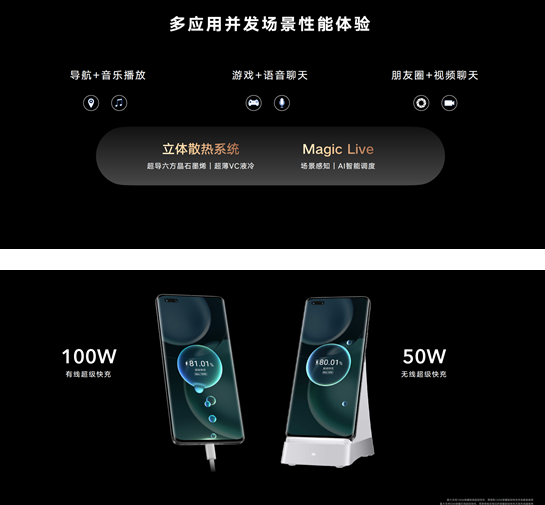 荣耀还解决了当前很多旗舰手机发热大、功耗大的痛点。荣耀Magic4系列搭载当今业界超强的旗舰移动处理器,凭借强大的技术实力和芯片调校能力,将硬件效能最大限度的发挥,实现了极为领先的速度表现。与此同时,荣耀Magic4系列还配合全新升级的Turbo X技术、硬件散热系统和高速安全的快充组合,为用户提供了顺滑的系统操作,流畅的影音游戏体验,均衡的功耗和发热表现,实现了更为持久的运行和快速电能恢复能力。