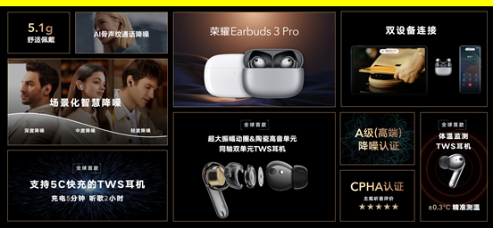 和荣耀Magic4系列一起发布的还有年度音质旗舰耳机荣耀Earbuds 3 Pro。作为荣耀音频布局TWS高端市场的重磅新品,荣耀Earbuds 3 Pro搭载了行业领先的超宽频同轴双单元和场景化智慧降噪等顶级配置,应用了体温AI监测、5C快充等行业创新技术,强势入局TWS耳机头部阵营,为用户带来一款技术创新与综合体验俱佳的年度诚意之作。