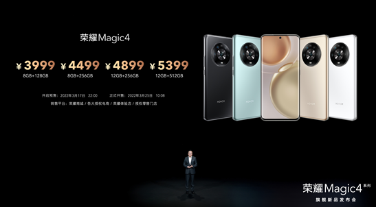售价方面,荣耀Magic4 8GB+128GB版、8GB+256GB、12GB+256GB、12GB+512GB版价格分别为3999元、4499元、4899元、5399元;荣耀Magic4 Pro 8GB+256GB版、12GB+256GB、12GB+512GB版价格分别为5499元、5899元、6499元;荣耀Magic4至臻版12GB+512GB版为7999元,荣耀Earbuds 3 Pro售价899元。