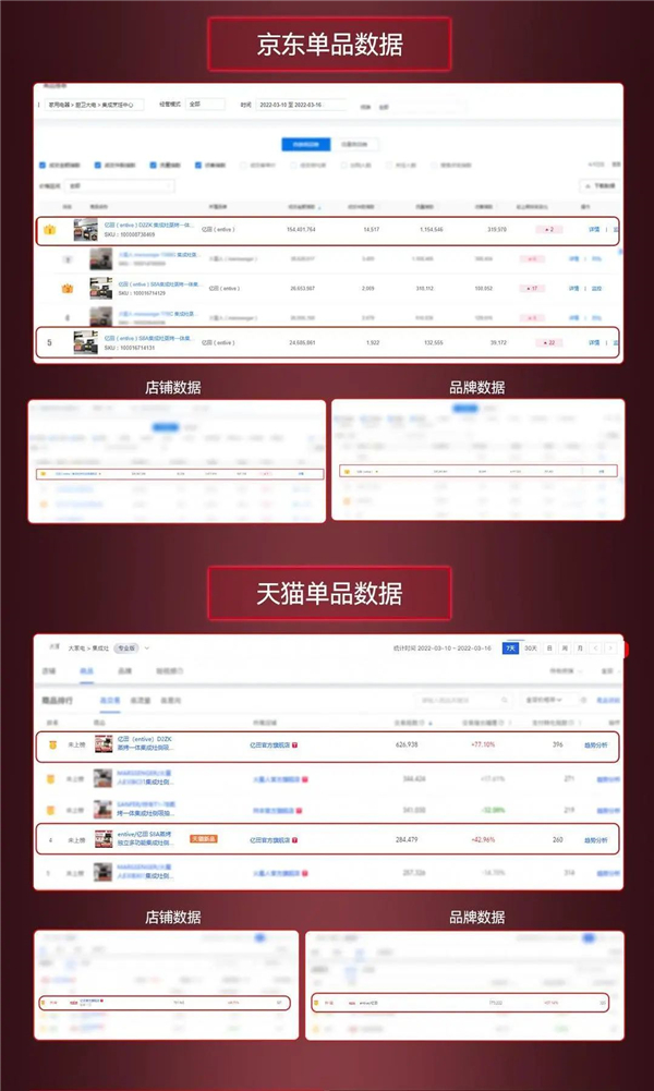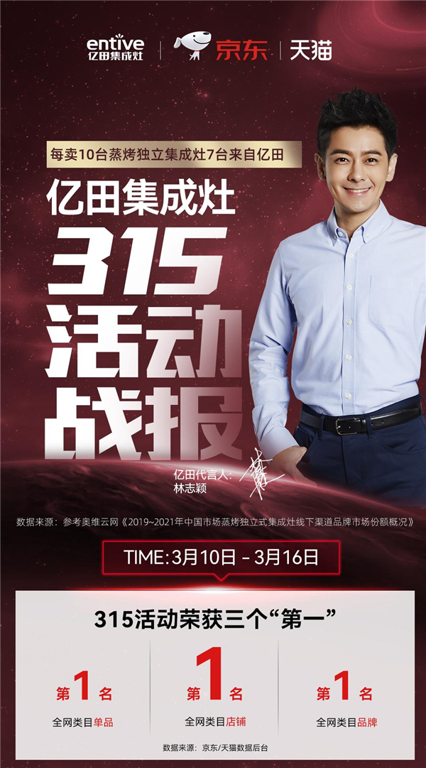 据京东与天猫数据后台显示,3月10日至3月16日,亿田荣获三个“第一”,全网类目店铺第一!全网类目品牌第一!全网类目单品第一!(全网:仅指天猫、京东电商平台)