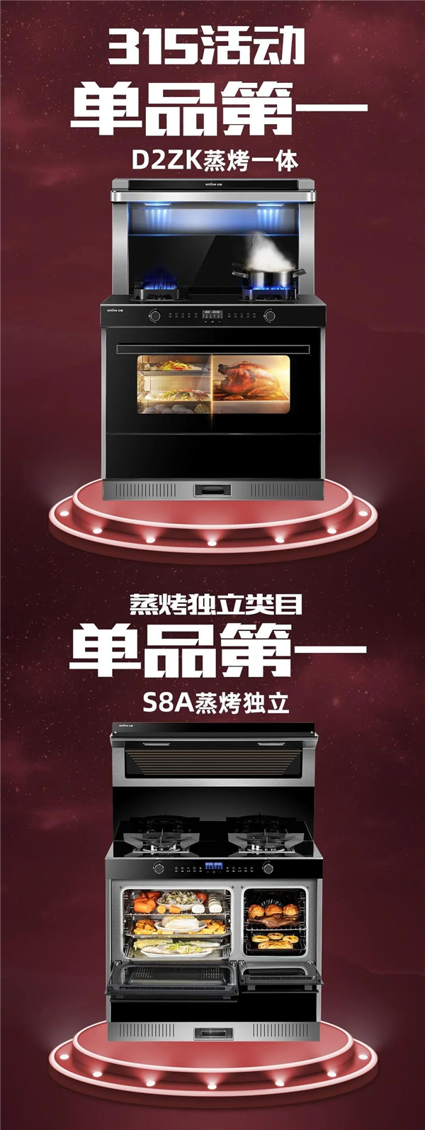 亿田S8A蒸烤独立集成灶继元旦首发期间,荣获全网第一单品后,315活动期间,再度展现不俗风采,摘得蒸烤独立类目单品第一!